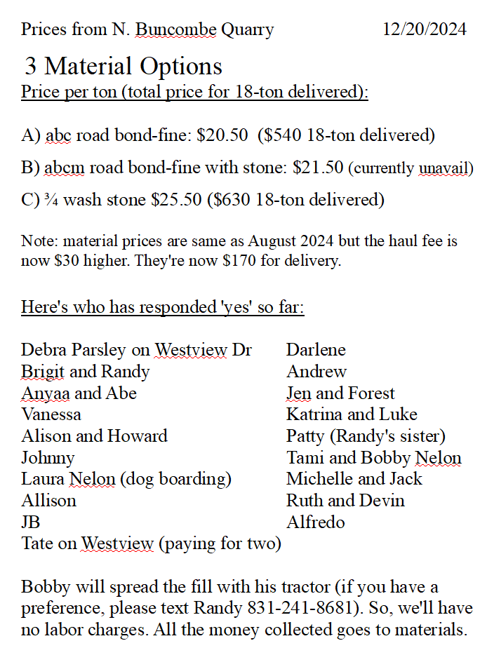 12/4/2024: Johnny responded regarding the 3 road material options: