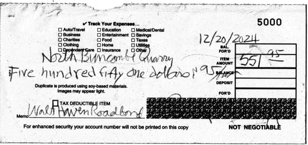 BECAUSE WE HAD GOOD PARTICIPATION, THE AMOUNT OF MONEY BEING REQUESTED FROM EACH OF THE 20 PARTICIPATING HOMES IS $27.50. ($27.50 x 20 homes = $550. See roadbond receipt.)